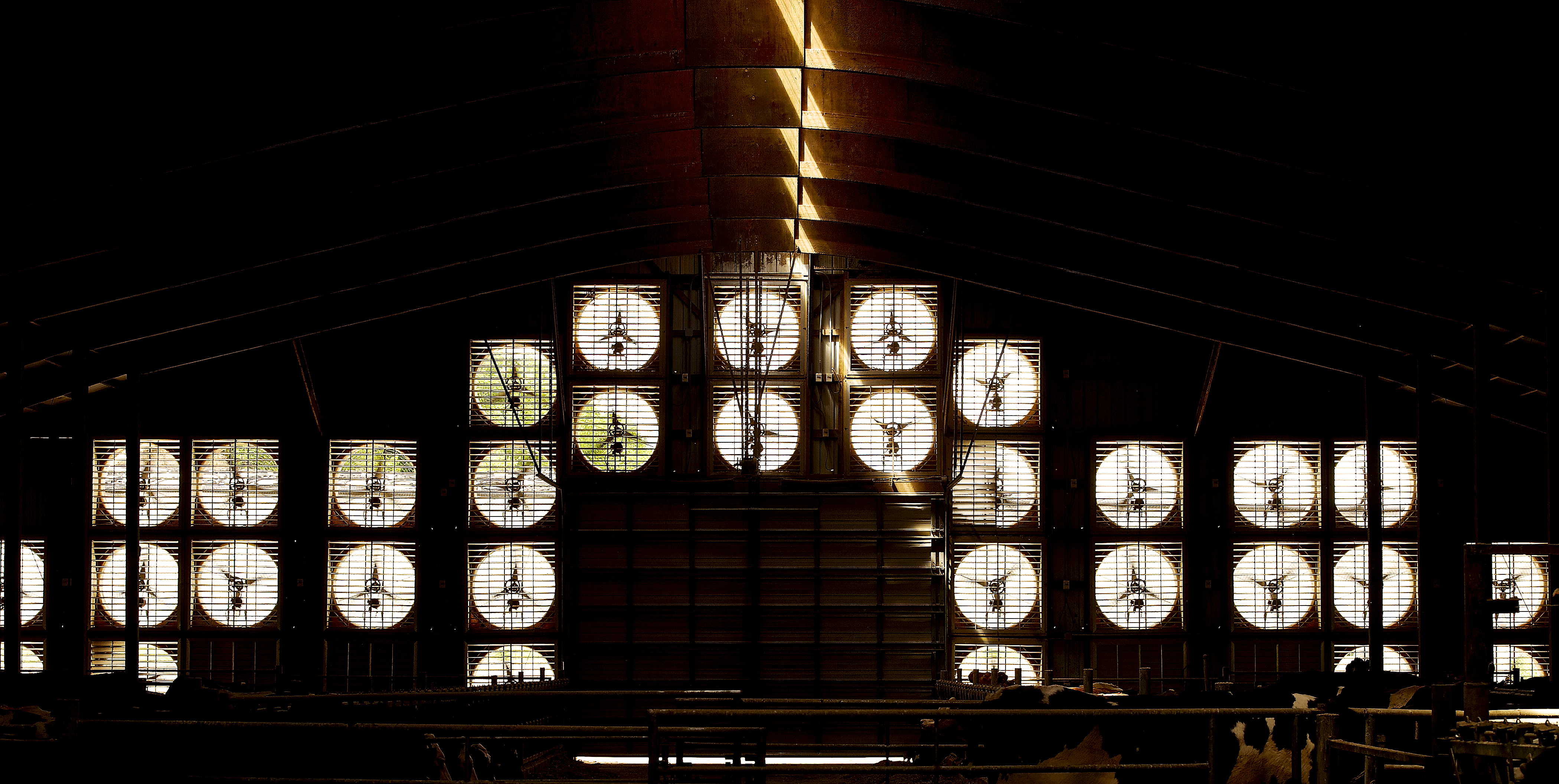 At this time of year, the curtains are actually up, not down as you would think they’d be. With the curtains closed, we can control the maximum amount of air exchange and cooling in the freestall barn. It’s just like having air conditioning in the barn for the cows. Our goal is to get from seven to nine MPH of wind or breeze through the barn to cool the cows. Hopefully, the inside temperature of the barn is a minimum of ten to twelve degrees cooler than the outside of the barn.