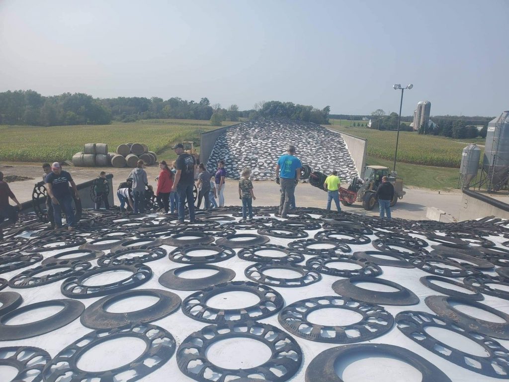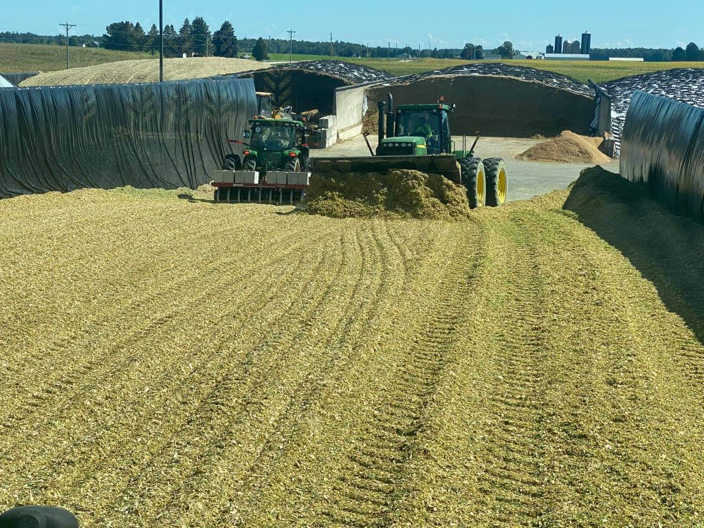 When the chopper harvests a field, the tiny pieces of the corn plant are delivered to the bunker. At the bunker, the tractors drive back and forth over the pile packing everything down as tight as possible. Once the bunker is full we cover the pile with an oxygen barrier. An oxygen barrier is a thin sheet of plastic, similar to the plastic wrap you use in the kitchen. It sticks right to the top of the silage to keep oxygen out so the feed can ferment. On top of that a thicker plastic cover that keeps the feed protected from weather and wildlife and is weighted down with tires, tops the pile off.